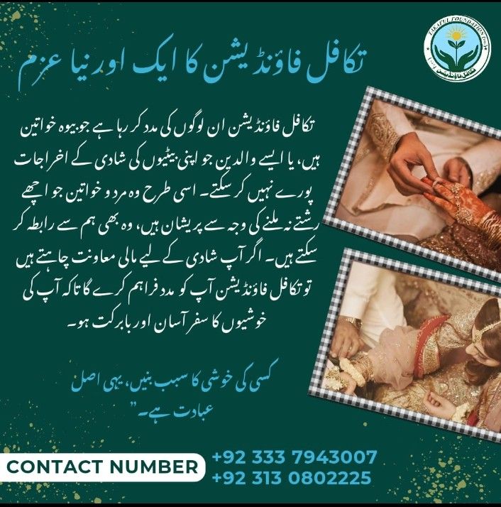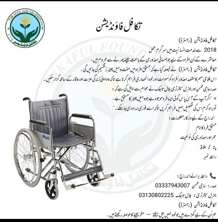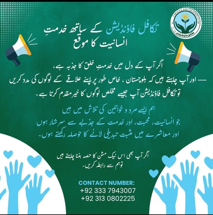 Takaful Foundation is a charitable organization based in Quetta, Balochistan, dedicated to supporting Thalassemia patients, promoting children’s education, and uplifting underprivileged communities. With compassion at its core, the foundation works tirelessly to assist widows, help poor families with weddings, provide food and essential supplies, and empower persons with disabilities.
